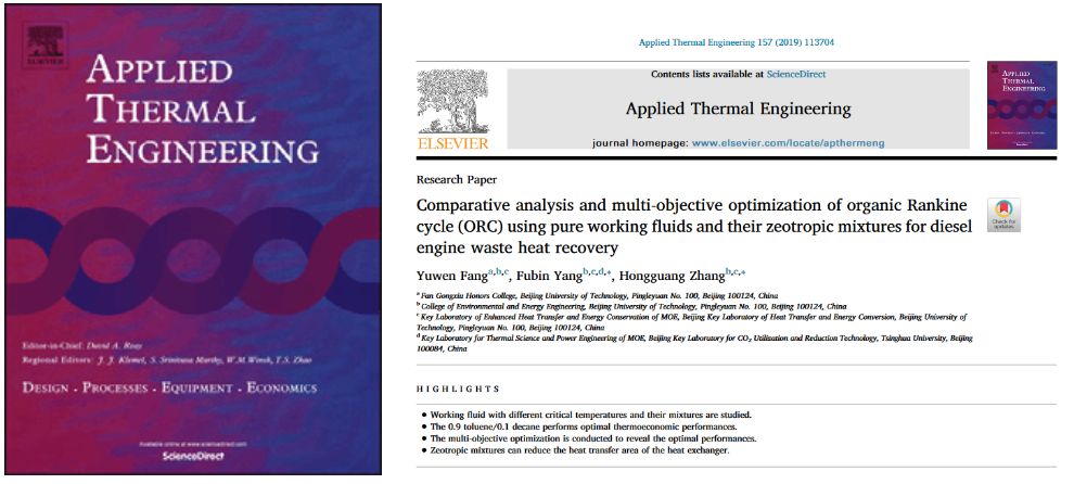 2019年5月2日,2015级本科生方钰文同学(能源与动力工程专业)以第一作者身份在SCI期刊《Applied Thermal Engineering》(JCR Q1,影响因子3.771,CiteScore 4.14,工程大类2区)上发表了题为Comparative analysis and multi-objective optimization of organic Rankine cycle (ORC) using pure working fluids and their zeotropic mixtures for diesel engine waste heat recovery的学术论文。《Applied Thermal Engineering》是热力工程领域影响力较高的权威学术期刊之一,主要关注能源生产、存储、利用以及节能等热过程所涉及的装备、技术方面的创新研究。该论文为公司本科生首次以第一作者身份在SCI期刊上发表的学术论文。