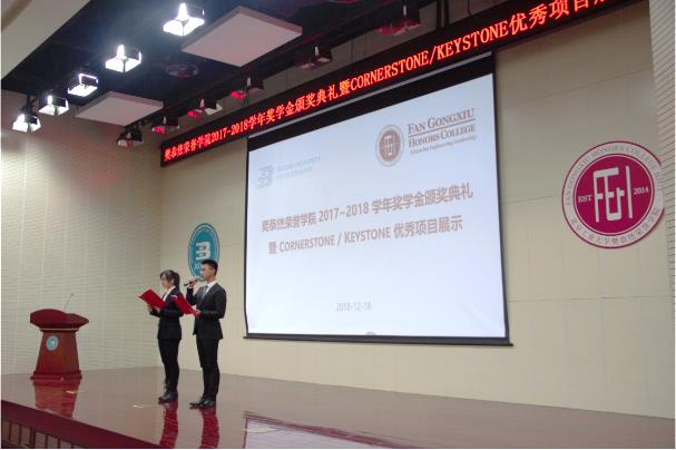 2018年12月18日晚六点,2017-2018学年奖学金颁奖典礼暨Cornerstone/Keystone优秀项目展示活动在知新园报告厅顺利举行。yl6809永利集团副董事长吴斌,党委员工工作部副部长韩薇,校团委副书记韩孟婷,yl6809永利经理孙治荣,副经理李洪义、副经理陈春跃,全体专兼职辅导员及专业课老师和公司全体员工参加了本次活动,会议由2018级刘雨晨、吴天鹤主持。