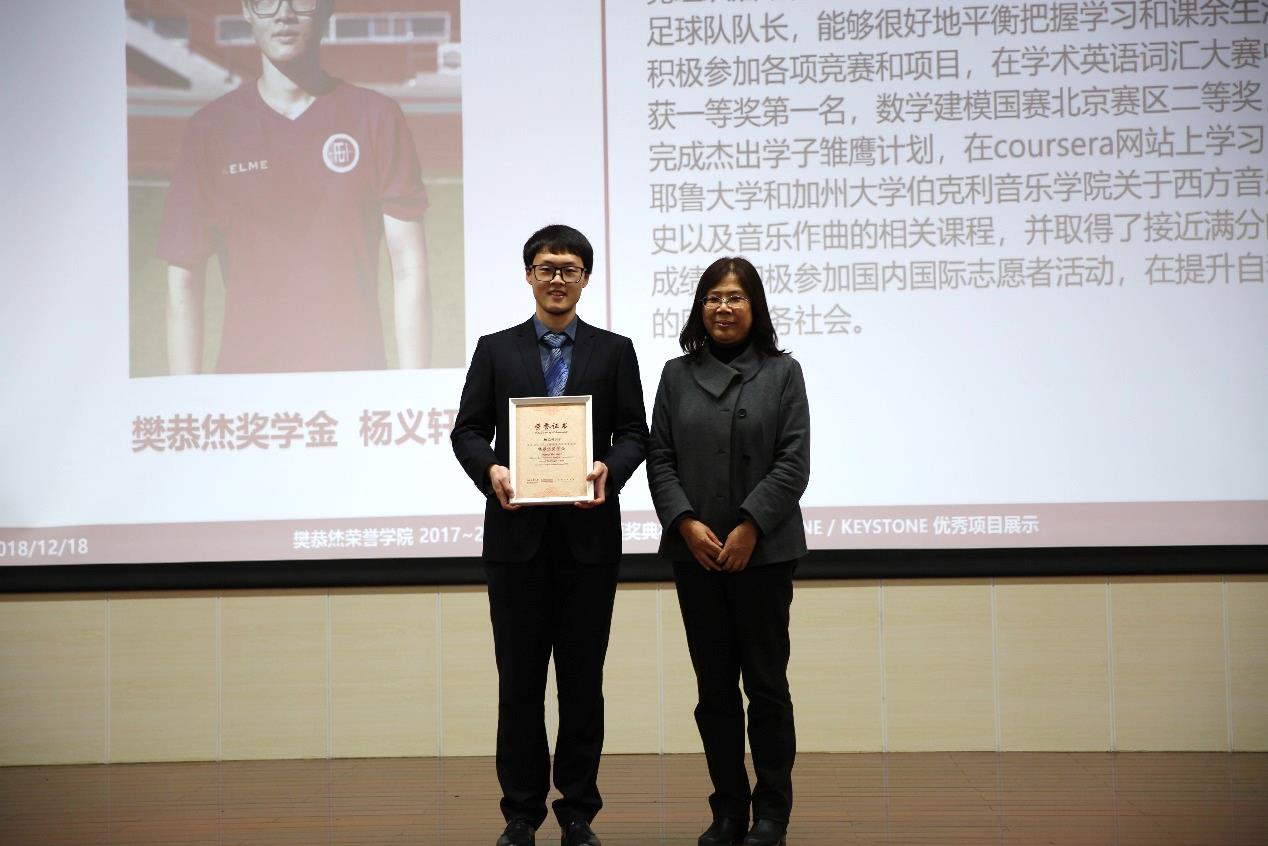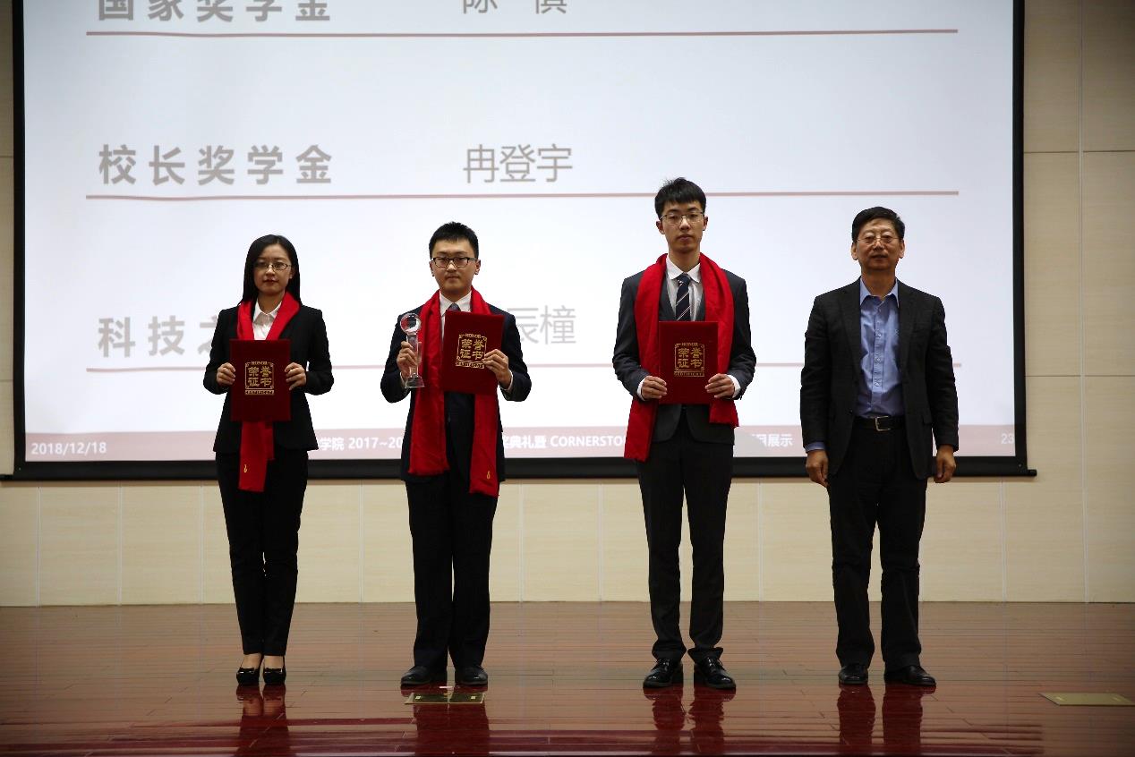 最后,副董事长吴斌教授为获得2017-2018学年国家奖学金的陈慎、董事长奖学金项目团队负责人冉登宇、校科技之星的相辰橦颁发荣誉证书。