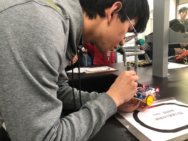 在一小时的参赛过程中,张家贝同学仅用20分钟就完成了小车的全部焊接,全程操作规范,表现突出,而且小车正向反向均正常行驶,获得了在场评委的一致赞誉。
