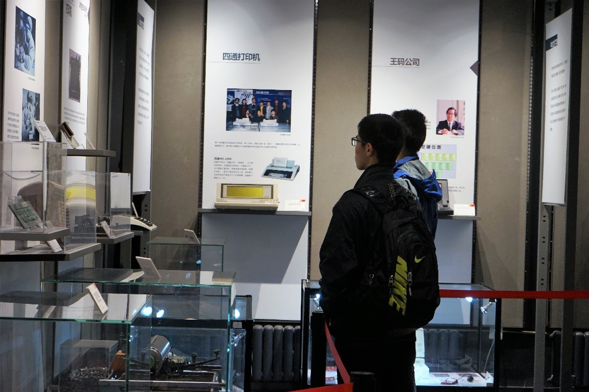 博物馆共分出了电脑区、手机区、游戏出版物等诸多不同区域。正门有两扇,左边黄色的门是金山软件1988年创业之初的门,右边红色的门是联想创业之初小传达室的门,推开这扇门,便是推开了中关村的历史。馆内一件件历经沧桑的老物件充满了历史感,立刻引起了同学们极大的兴趣。一边参观展品,同学们还一边听馆内讲解员介绍馆中展品背后酸甜苦辣的往事。