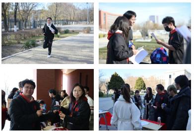 同学们在第四教学楼下集合领取打卡册,三院师生共同合影后大家纷纷出发,途经北操场、图书馆、科学楼、月亮湖等打卡点,回答党史、冬奥会等问题依次闯关,最终回到第四教学楼。