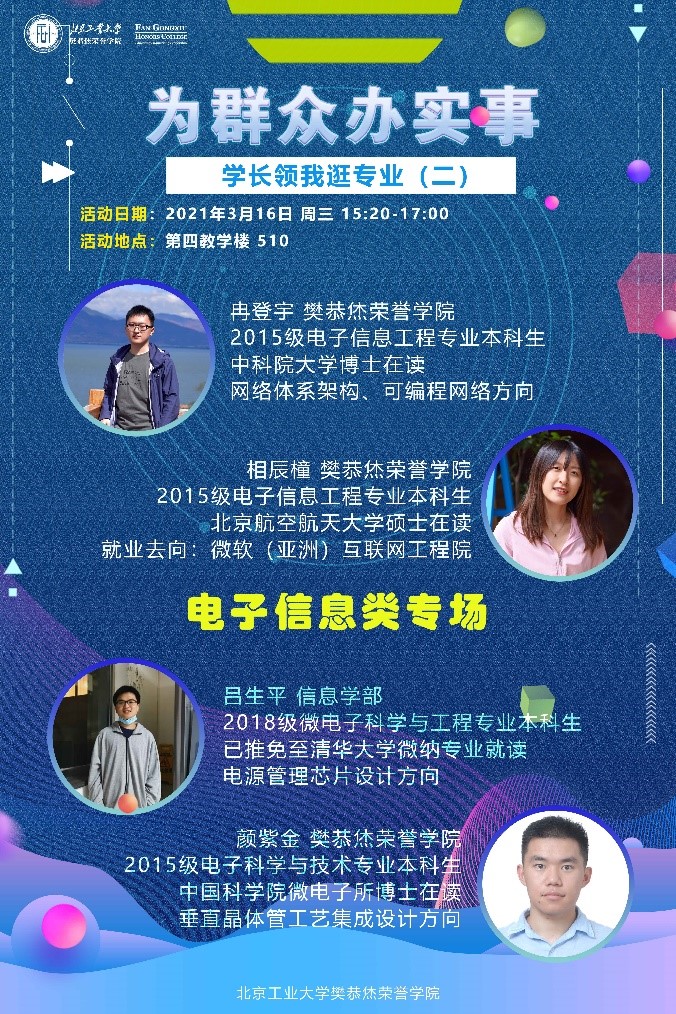 为了指导同学们的专业选择,帮助同学们明确未来专业方向,yl6809永利于3月16日下午在第四教学楼510教室召开了第二场“学长领我逛专业”电子信息类专业分享活动。公司邀请了2015级电子信息工程专业的冉登宇学长和相辰橦学姐,2015级电子科学与技术专业的颜紫金学长和2018级微电子科学与工程专业的吕生平学长,活动由班主任助理陈宇卿主持。