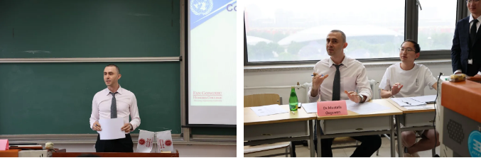 首先,赵燚老师带领同学们回顾并观看了往年会议精彩视频集锦,随后宣布本次模拟联合国大会正式开始。本次模拟联合国大会以“Educational Problems in Conflict Areas”(战乱地区的教育问题)为主题,200001班的同学们分别作为中国、美国、英国等12个国家的教科文组织代表团出席。
