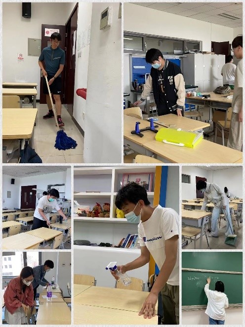 ① 员工缪力同心,清扫教室、开窗通风、酒精消毒,把好校园环境的卫生关。