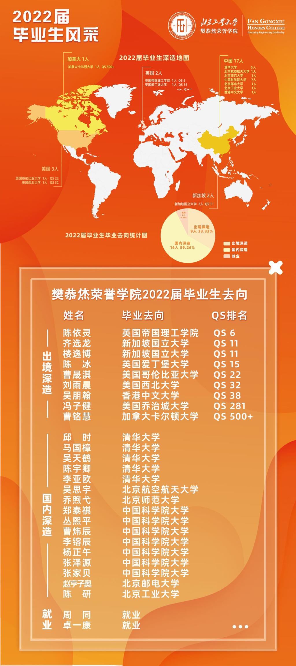 自2018年首届员工毕业以来,公司毕业生深造率不断提升,累计5届毕业生,共计142人,毕业率100%,总深造率90%以上。2022届共计毕业生27名,就业率100%,深造率92.6%,毕业生前往清华大学、中国科公司大学、北京航空航天大学等国内高水平院校深造16人,占59.3%,其中超过80%的国内深造的高校和科研单位学科评估等级为A以上;前往英国帝国理工公司、新加坡国立大学、美国哥伦比亚大学、香港中文大学等境外院校深造9人,占33.33%,境外深造的院校2023 QS排名前50的占比达到77.8%以上;2022届毕业生人才培养成果显著,深造情况达历史最好水平。
