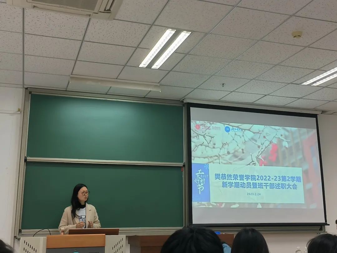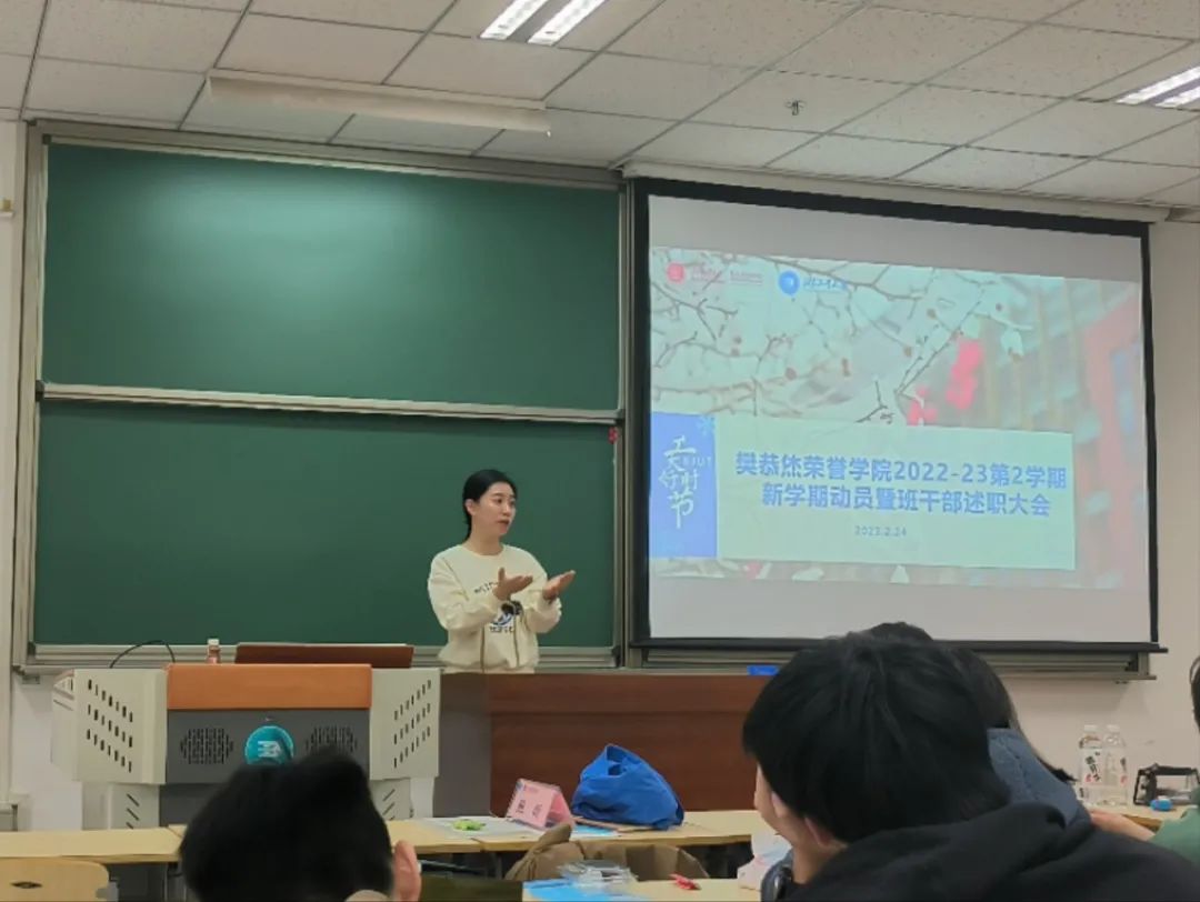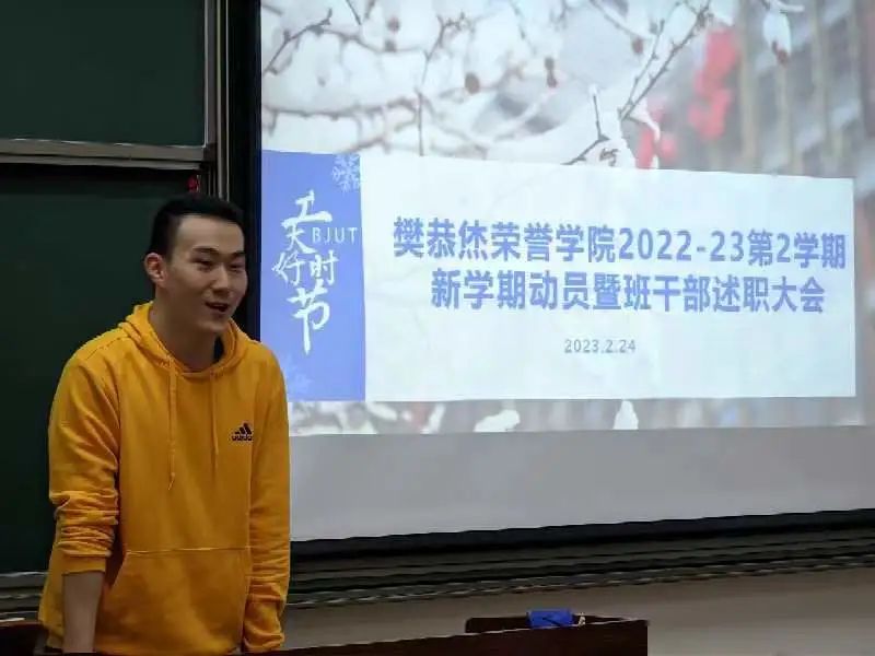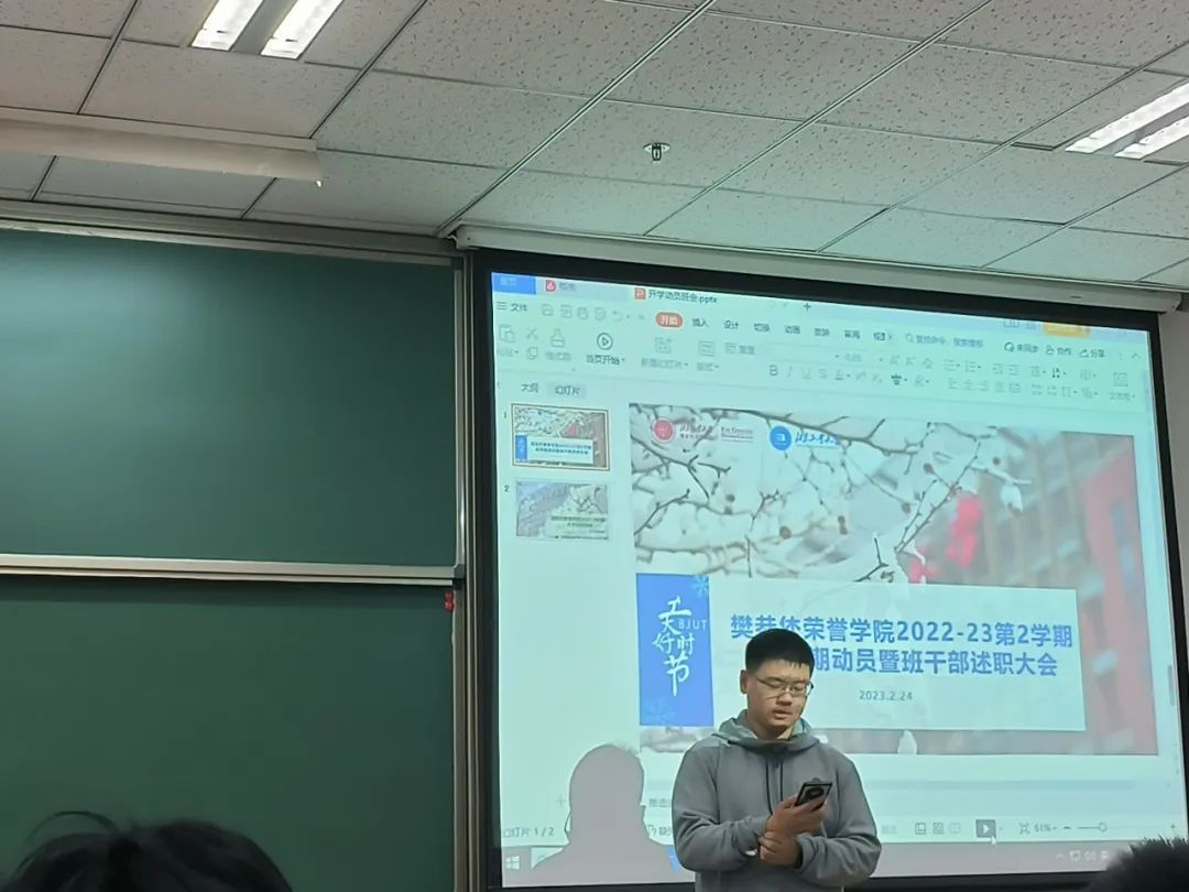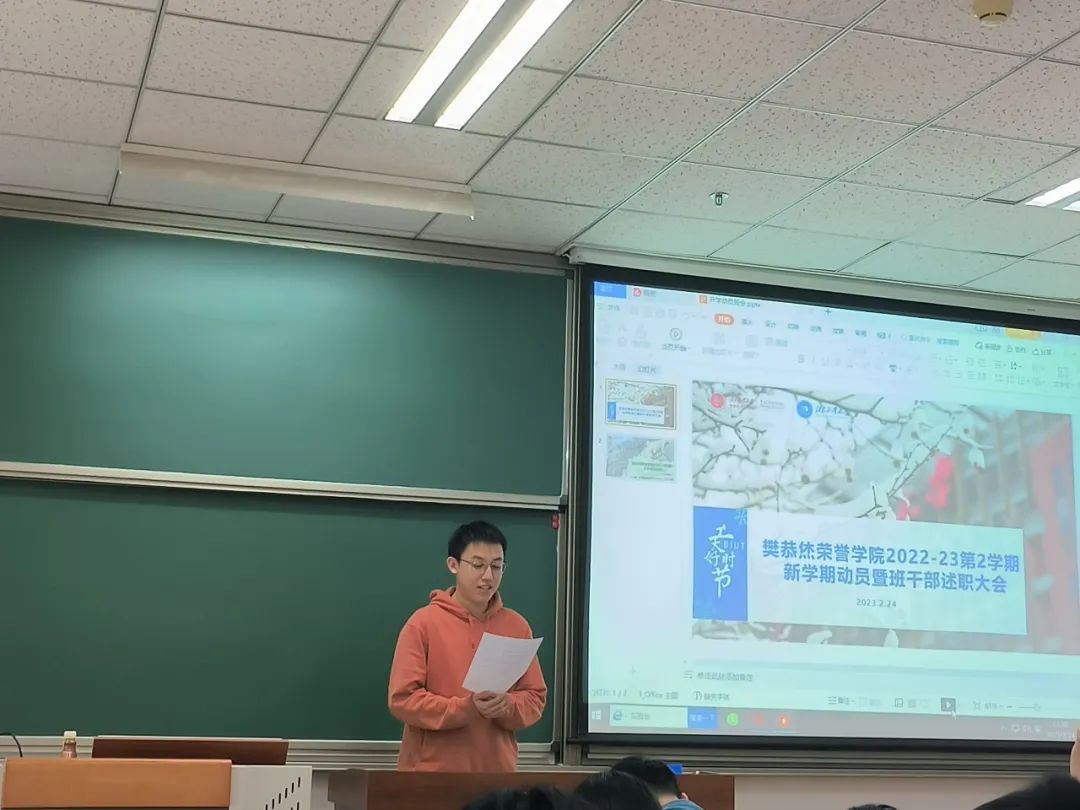 不负春日好时光,鸟语花香读书时,寒假已结束,同学们回到了美丽的校园,开始了新一学期的校园生活。2月24日的下午,在两位班长的主持下,2022级全体同学召开了新学期动员和干部述职报告。