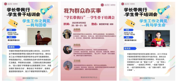 通过学长学姐的分享,我学习到了许多知识。在会上,张洪滨学长讲述了他心中的樊院精神“学而不霸”和“不至于卓越”和学干工作意义并用他在员工会期间组织的一些活动的成果进行说明。韩柳彤学长讲述了他通过组织一些有意思的活动去让同学的生活更多彩,同时提升公司的凝聚力。
