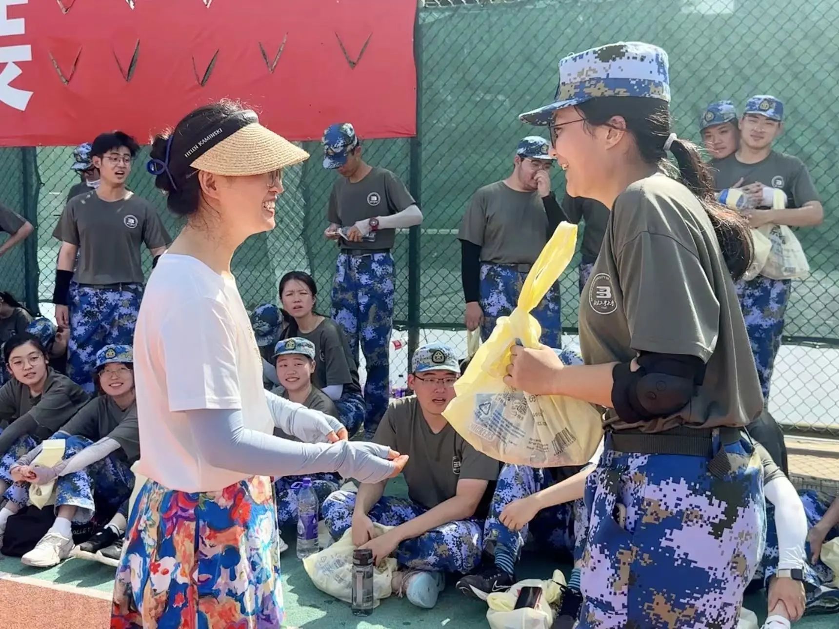 数日高温无法磨灭同学们的意志,随着日程过半,分列式队列行进初见成效。清风细雨吹走了同学们心中的劳累与焦躁。教官每天都反复提醒大家“吃早饭”、“泡泡脚”,放下严格的一板一眼,通过一次次“唠叨”在细节上对同学们给予满满的关爱。公司与公司屡屡为同学们送来消暑物资,副经理袁莉敏老师亲切地慰问了同学们,她对同学们昂扬的士气表示高度赞许,叮嘱同学们在当前高温的不利条件下做好防暑措施,注意休息和补水,鼓励同学们继续发扬不怕苦不怕累的精神,以饱满的精神状态完成后续的训练任务。指导员戴璐老师每日与同学们共同操练,做好后勤保障工作,为同学们及时补充“能量”,助力同学们在酷暑中舒畅满怀,为同学们的训练日程保驾护航。关怀的话语与举动使得同学们暂时忘记了汗流浃背的疲惫,收获了“能量加油站”的满满喜悦。