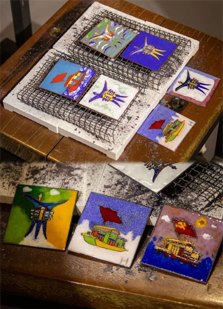 点蓝过后是烧蓝环节。烧蓝是将整个胎体填满色釉后,再拿到炉温大约800摄氏度的高炉中烘烧,色釉由砂粒状固体熔化为液体,待冷却后成为固着在胎体上的绚丽的色釉,此时色釉低于铜丝高度,所以得再填一次色釉,再经烧结,一般要连续四五次,直至将纹样内填到与掐丝纹相平。同学们完成后,排队拿着自己的作品,放入“烤炉”等待自己的完成品“出炉”。