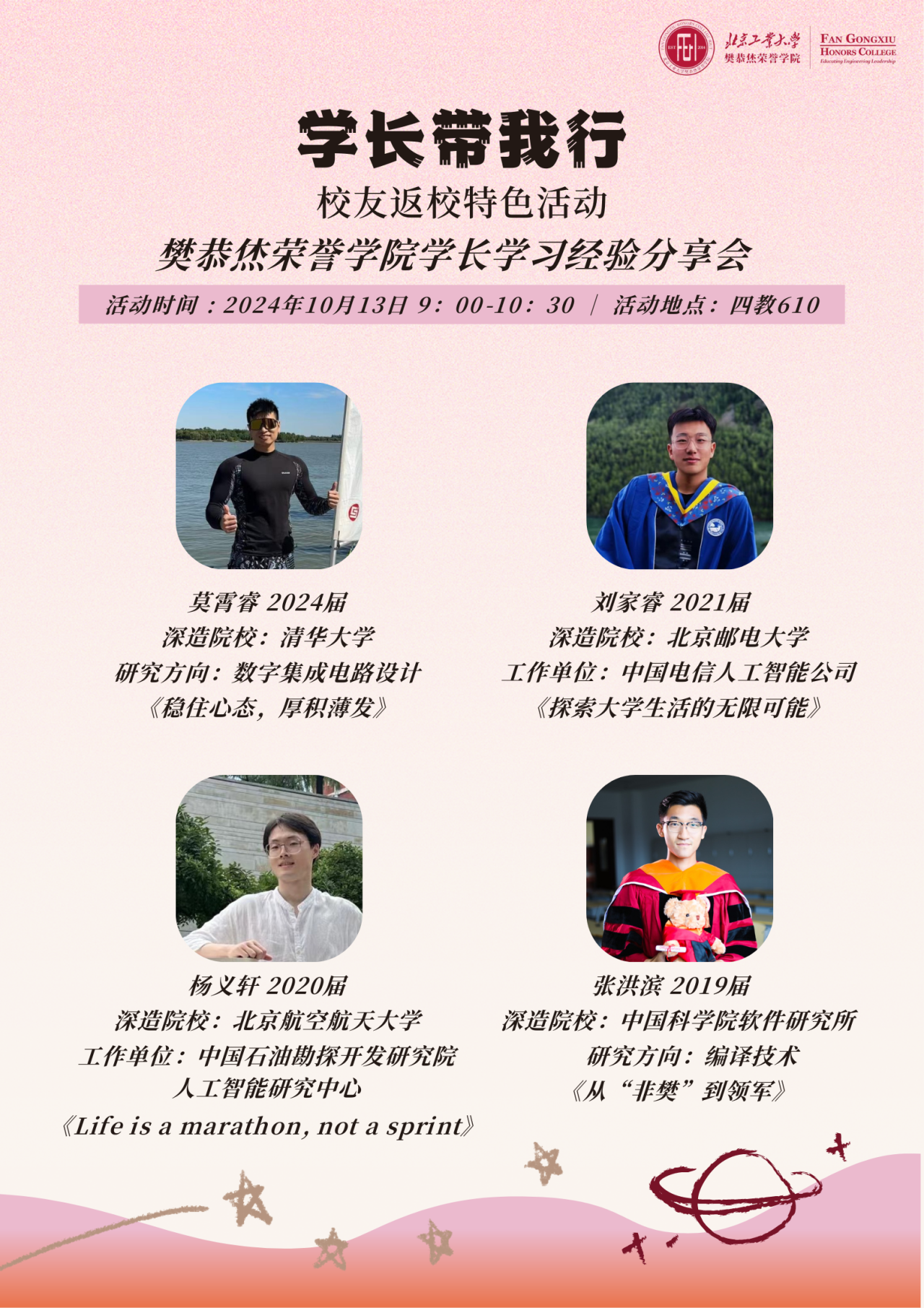 在秋高气爽的十月,yl6809永利集团迎来了64周年校庆。在这个意义非凡的时刻,yl6809永利于10月13日在四教610举办了一场别具一格的“学长带我行”活动,即员工返校活动暨经验分享会。公司领导孙立山经理、袁莉敏副经理,以及综合办公室戴璐和张萌老师出席了此次活动。