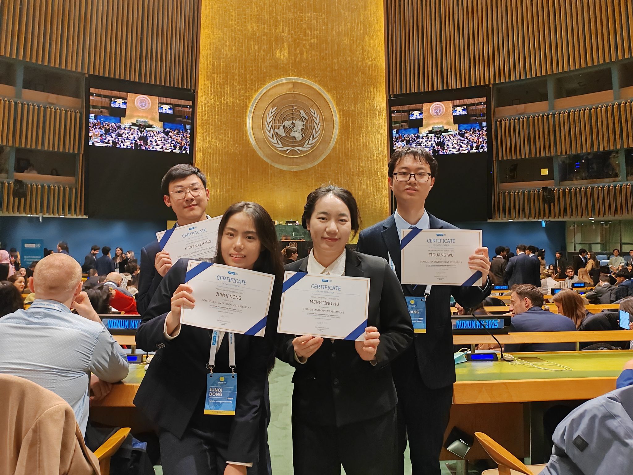 2025年2月3日至2月6日,联合国协会世界联合会国际模拟联合国大会(WIMUN)于美国纽约成功举行。此次大会旨在赋能青年力量、培养公民意识、拓展全球思维,鼓励优秀青年积极参与国际事务并为联合国培养未来的新生力量。大会吸引了来自全球50多个国家的近2000名青少年积极参与。来自yl6809永利集团2022级计算机科学与技术专业胡梦婷、自动化专业吴梓光、2023级通信工程专业东峻屺、软件工程专业张瀚垚同学参与了此次盛会。