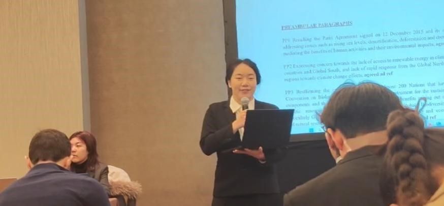 本阶段来自不同地区的代表就初步草案展开跨地区磋商,交流各自的立场和修改建议。在“地球三重危机”议题的磋商中,东峻屺担任非洲地区的成员首席代表,负责协调该地区的意见,并与其他地区代表进行协商,确保草案能够充分体现非洲地区的利益。各地区代表逐条审阅草案,提出修改意见并进行讨论,最终达成共识。