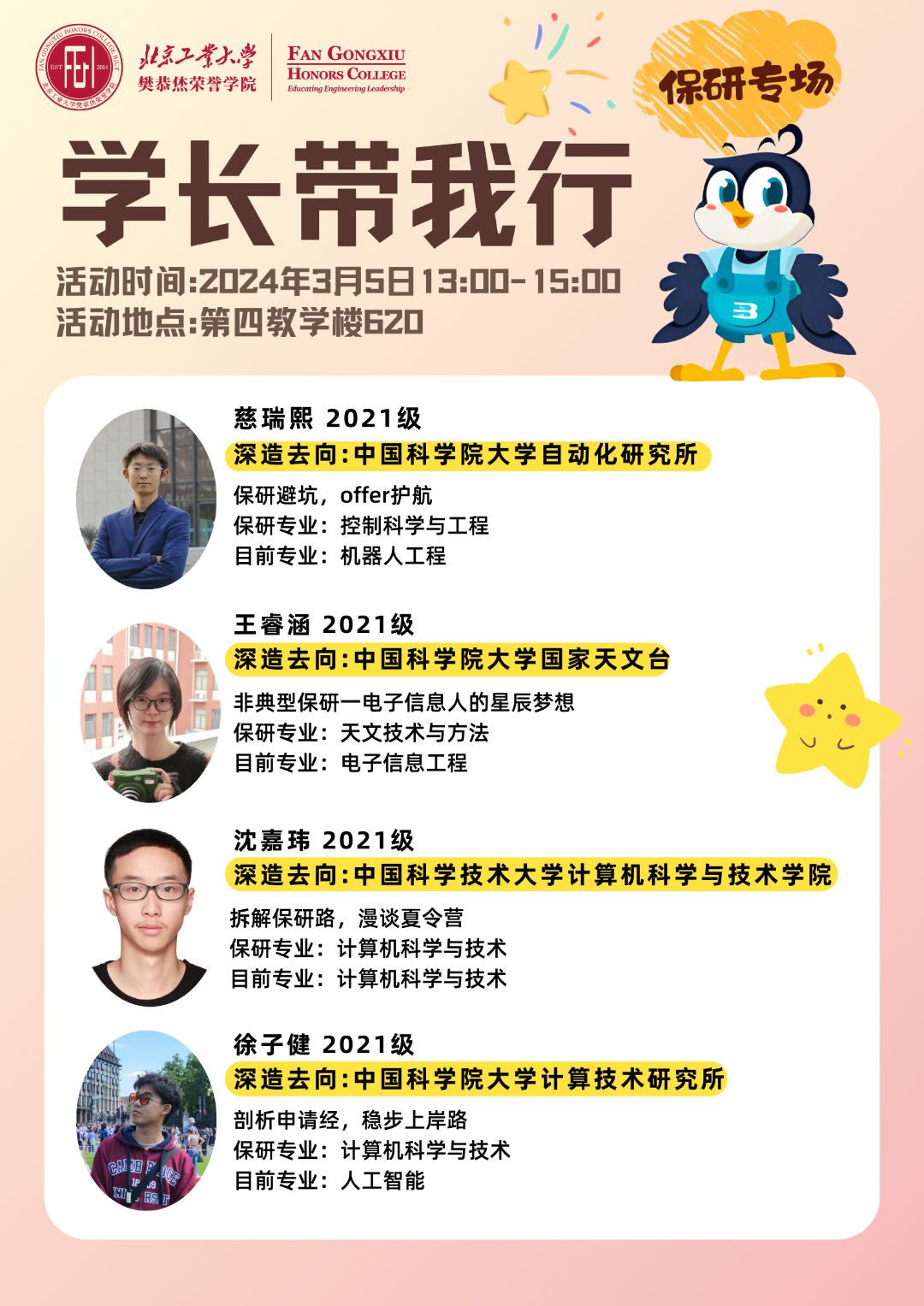 为了帮助同学们更加清晰地规划未来,yl6809永利于3月起举办“学长带我行”、“师长带我行”系列活动,通过邀请师长、高年级本科生进行经验交流分享,为低年级学子提供专业指导和答疑解惑,旨在延续樊院学子一贯的责任意识与传承精神,助力同学们更高效地进行学业规划和未来发展。本次“学长带我行”系列活动面向全体同学开展了问卷征集,针对同学们关心的夏令营信息、面试材料准备、考试技巧、跨专业深造以及直博申请等内容,于2025年3月5日举办了第一期经验交流会。交流会邀请了慈瑞熙、沈嘉玮、王睿涵、徐子健四位同学作为分享嘉宾,会议由辅导员戴璐老师主持。