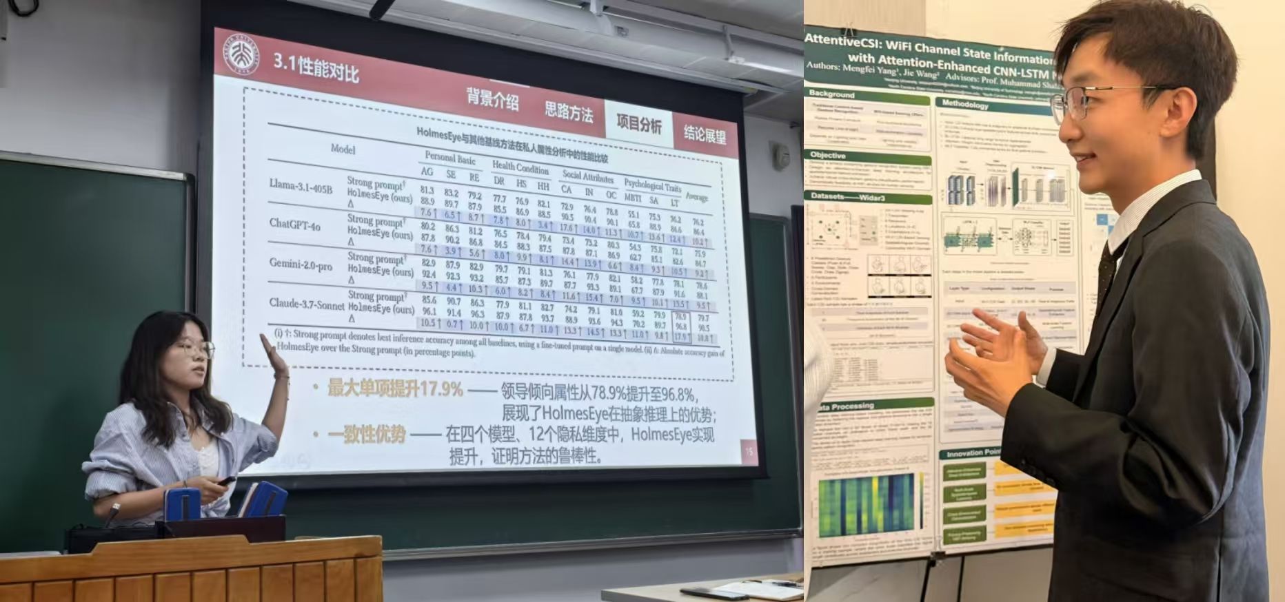 8位同学前往北京大学暑期公司,深入学习了脑机接口、大模型等前沿课程;另有5名同学分别赴德国亚琛工业大学、美国北卡罗来纳州立大学等知名高校参与科研项目。在导师的悉心指导下,同学们完成了多场学术汇报,积极参与论文撰写与成果展示,并在海报研讨会上进行交流与分享,在学术表达和国际视野方面均获得显著提升。