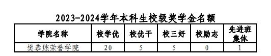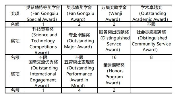 本科生:学习优秀奖、优秀员工干部、创新创业奖、三好员工、励志奖、先进班集体、优秀团支部、标兵团支部;