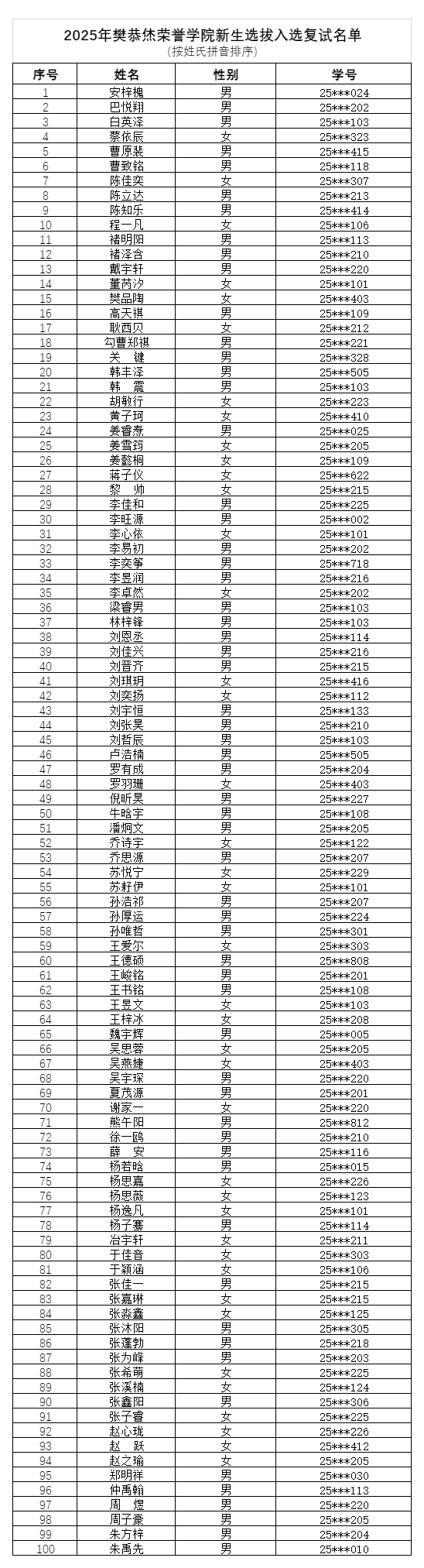 2025级yl6809永利新生选拔通过线下报名、材料审核、专家组评审,确定以下100名同学进入yl6809永利新生选拔复试。